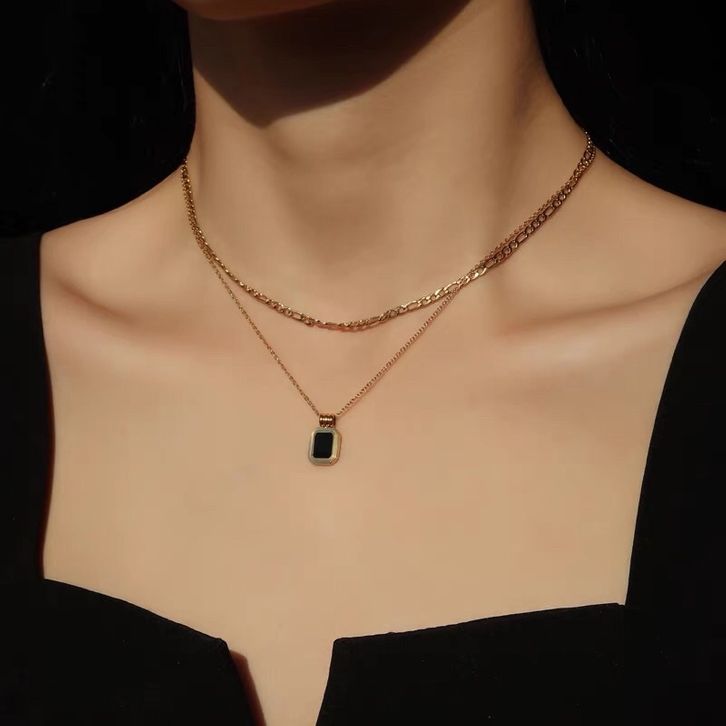 Kalung Titanium 2 Layer Black Square Korea Fashion Style