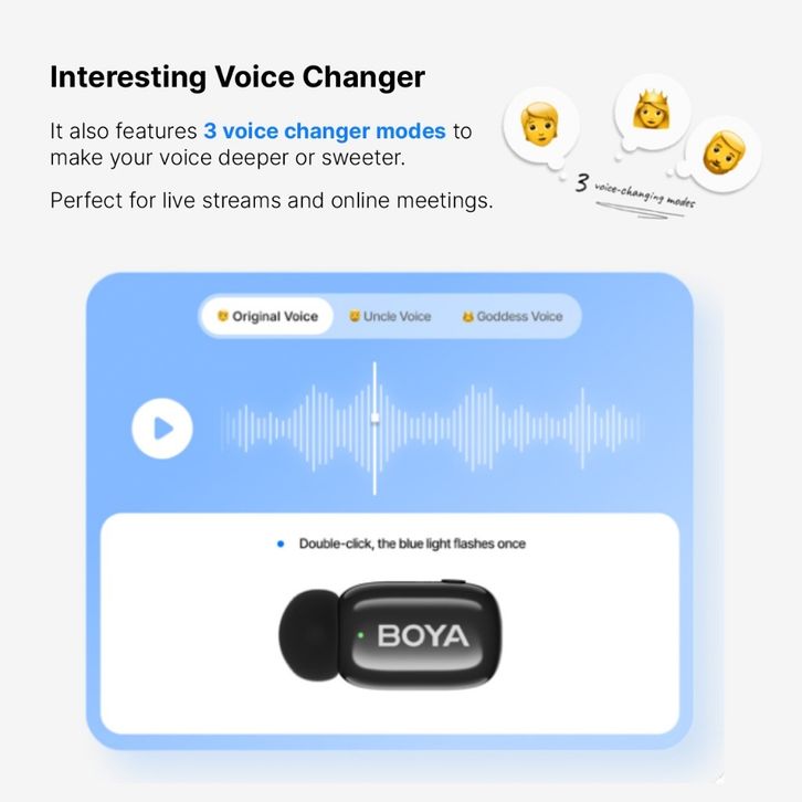 BOYA MINI MIC WIRELESS 2.4GHZ CLIP ON MICROPHONE AI VOICE CHANGER TYPE-C LIGHTNING 3.5MM