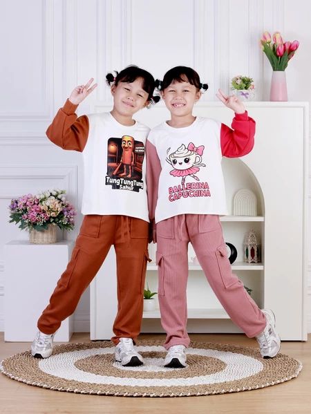 SETELAN ANAK TUNG TUNG SAHUR ANOMALI VIRAL SETELAN ANAK PEREMPUAN LENGAN PANJANG CELANA KARGO 3-12 TAHUN SET ANAK CEWEK