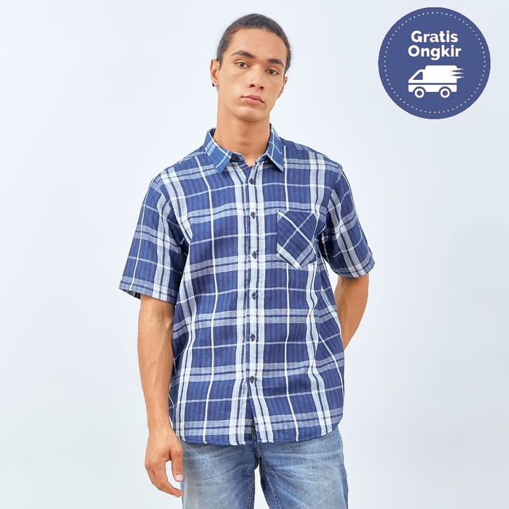 Kemeja Pria Yarn Dyed Double Face Kotak Pendek Navy 3068 M231