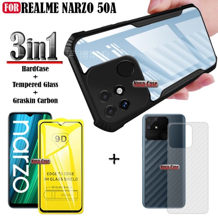 Paket 3 in 1 Realme Narzo 50A Hardcase + Anti Gores Kaca + Garskin