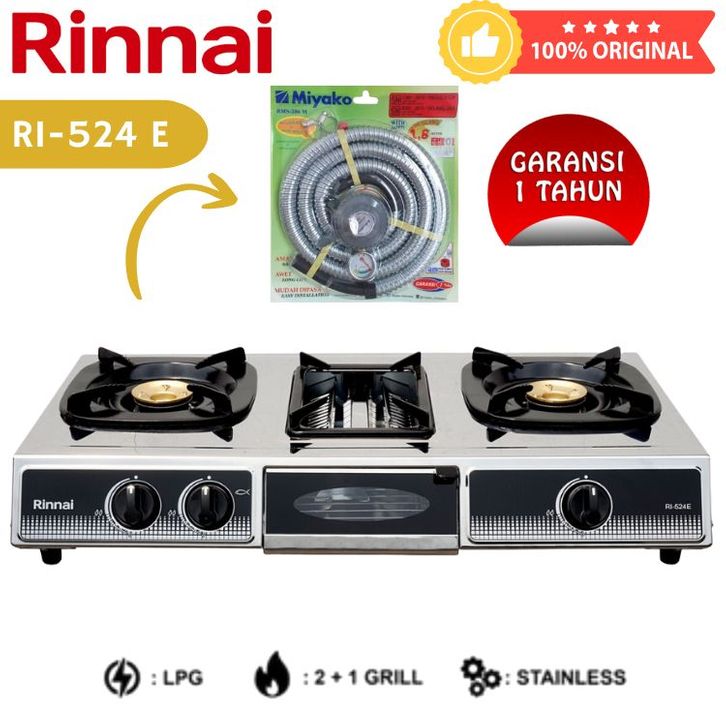 KOMPOR GAS RINNAI 2 TUNGKU RI 524E STAINLESS STEEL + GRILL PANGGANGAN BEST SELLER ORIGINAL OFFICIAL STORE