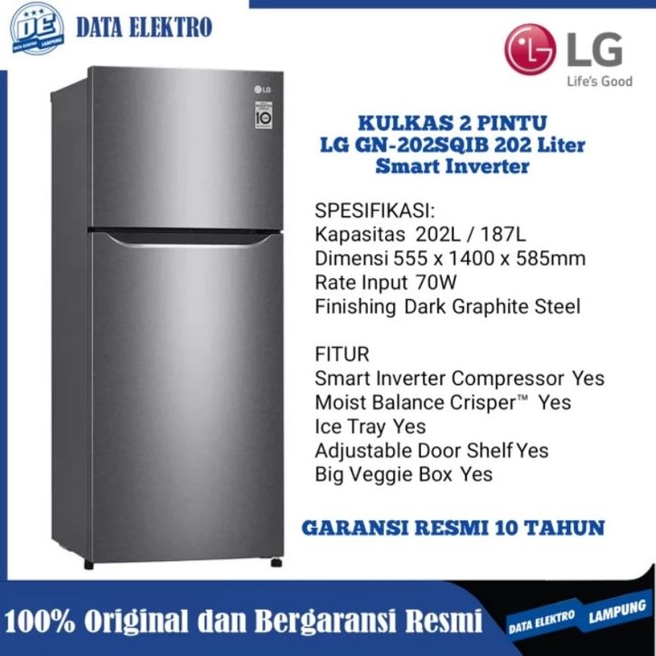 KULKAS LG 2 PINTU INVERTER GN-B202SQIB 202 LITER GROS / 187 LITER NET GARANSI RESMI 10 TAHUN