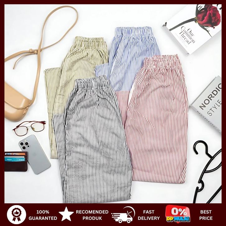 Celana Panjang Wanita Motif salur Casual Long Pants Bahan Kain Kulot Katun Jeans Terbaru Karet Murah Dewasa Jumbo