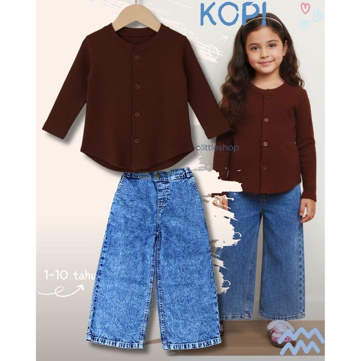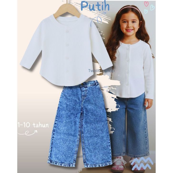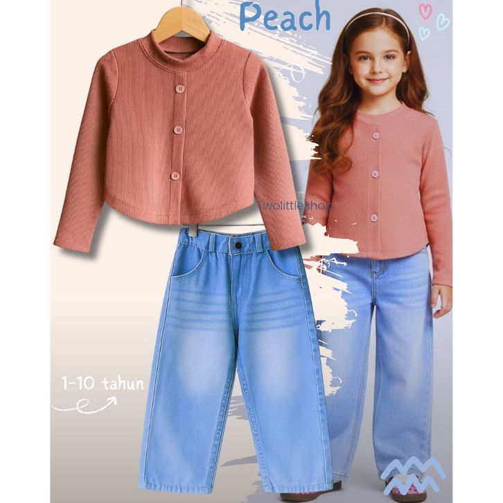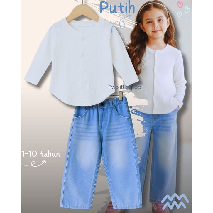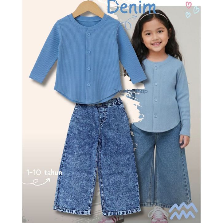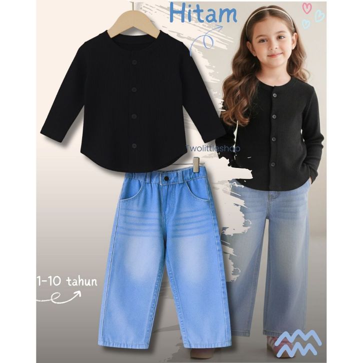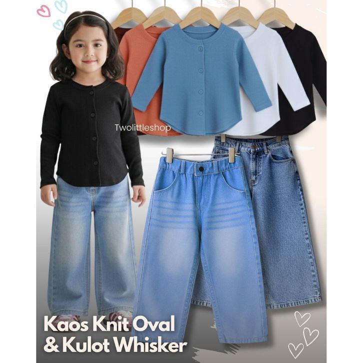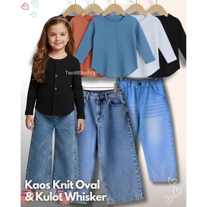 [Star] Setelan Anak Perempuan Usia 1-10 Tahun Oneset Atasan Kaos Knit Oval Lengan Panjang Celana Jeans Whisker Korean