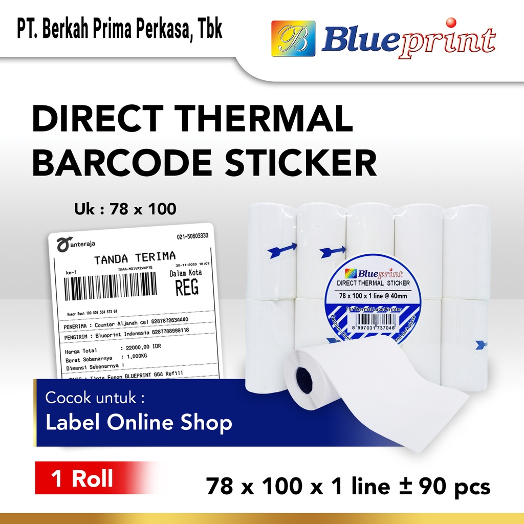 Direct Thermal Sticker Portable 78x 100 @40mm BLUEPRINT Stiker Label Resi 78x100 mm isi 90 Pcs - 1 Roll