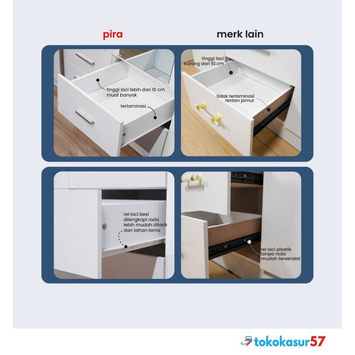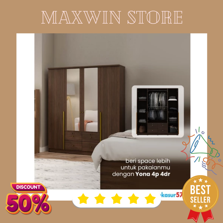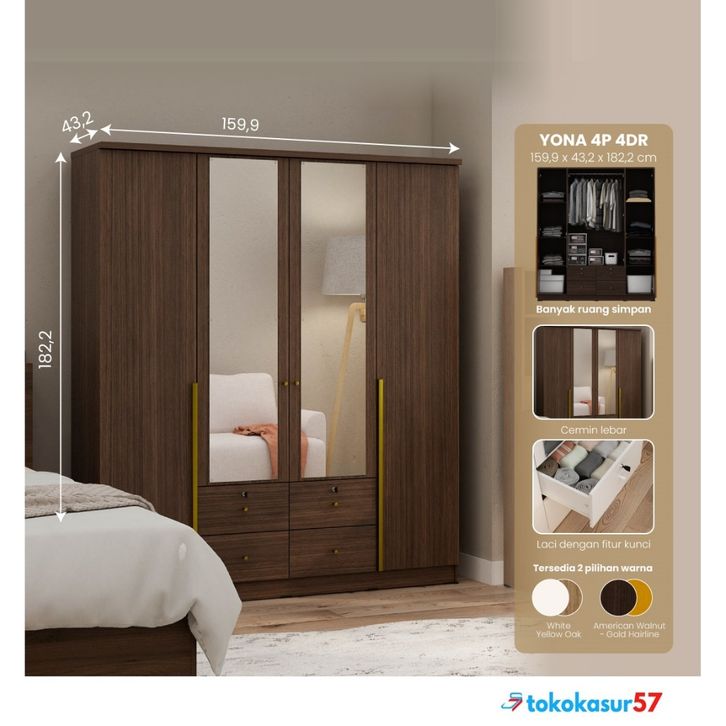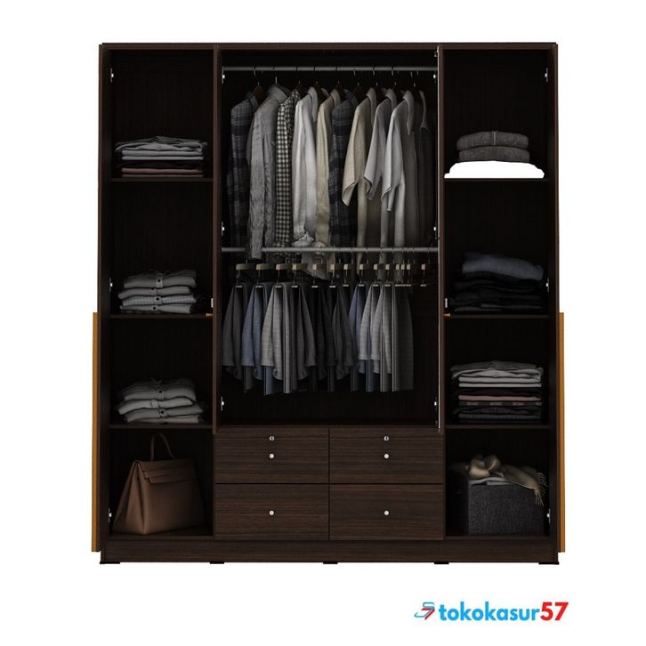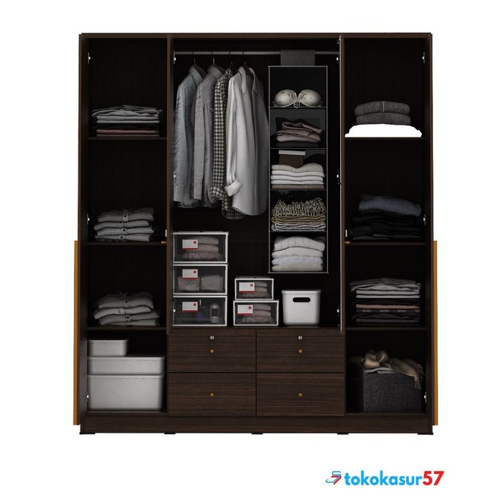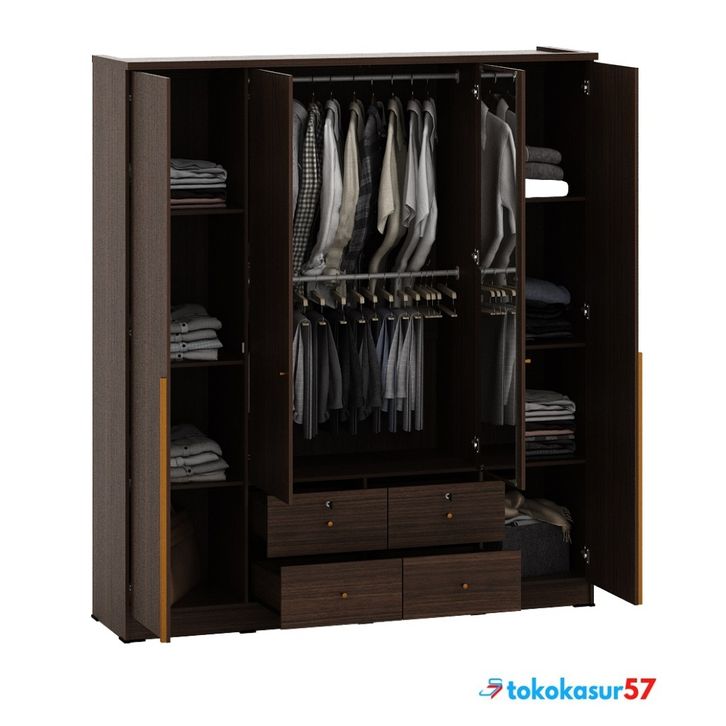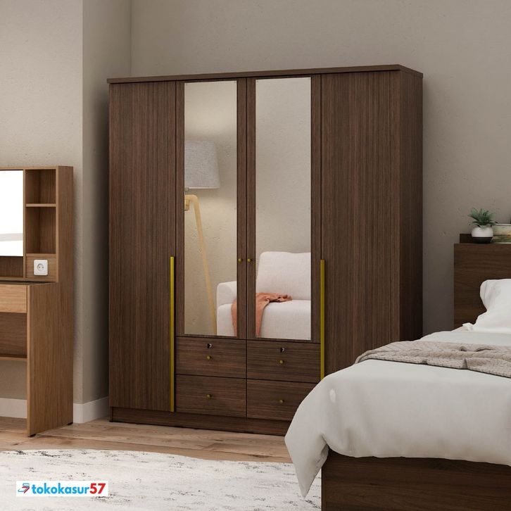 LEMARI PAKAIAN Jumbo 4 PINTU DENGAN LACI Warna American Walnut L.160 cm - PIRA / Lemari Pakaian 4 Pintu Jumbo knockdown