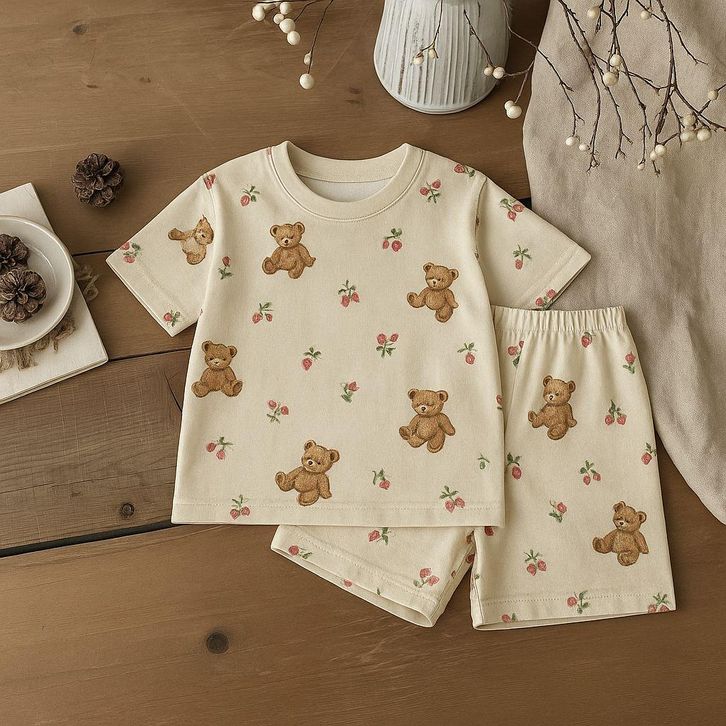 [Star] Setelan Anak Perempuan Usia 0-5Tahun Oneset Kaos Lengan Pendek Full Motif Cream Series Dan Celana Pendek Premium