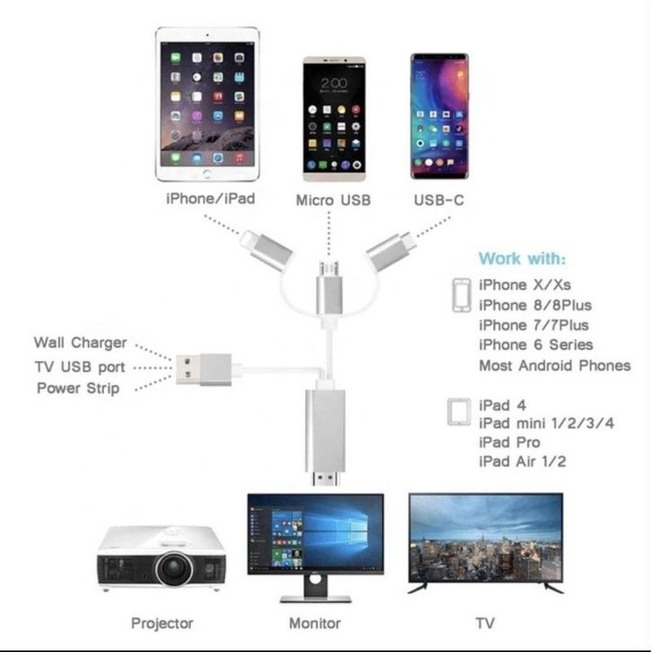 Kabel MHL 3 in 1 HP Android IOS ke TV HDTV HDMI Micro USB Type C Iphone Lightning Converter