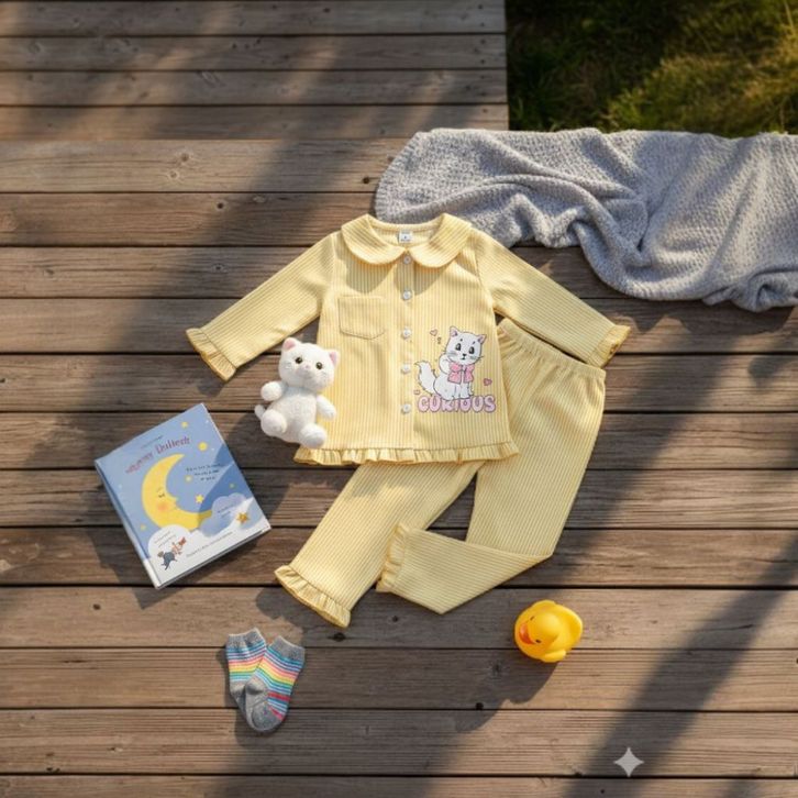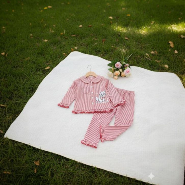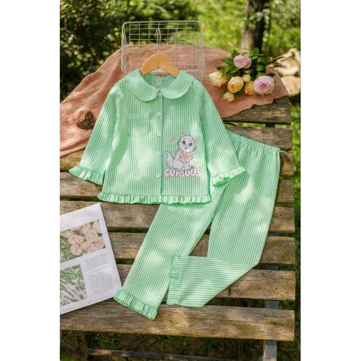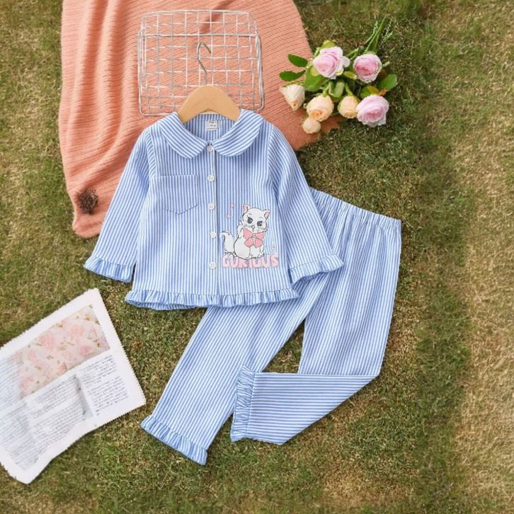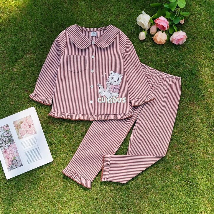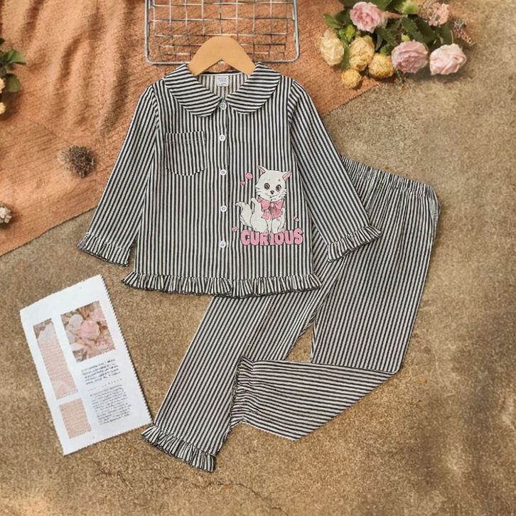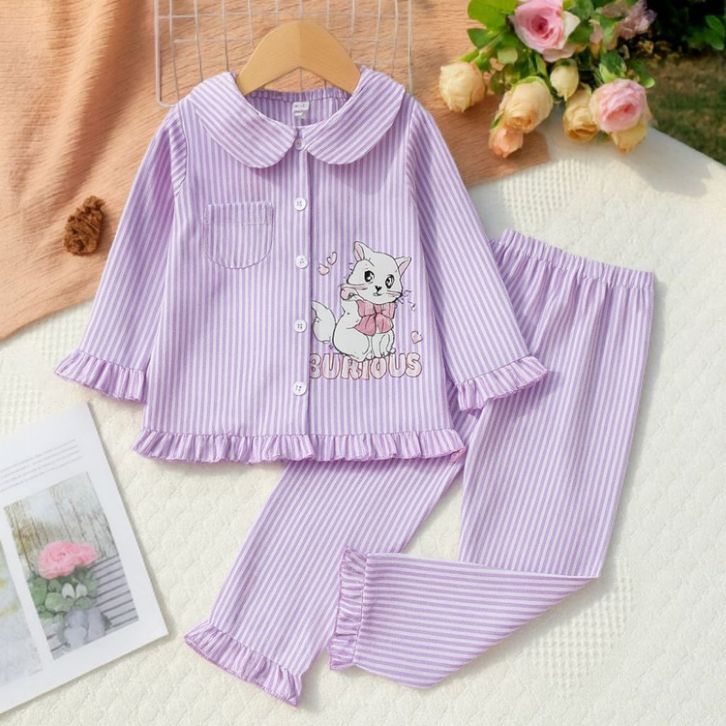 Set Piyama Anak Perempuan 1-8 Tahun Motif Kucing Garis Baju Tidur Lengan Panjang Katun Lembut Nyaman Dipakai