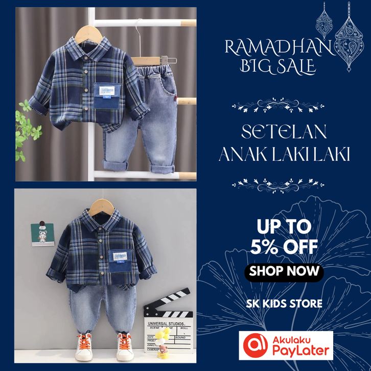 Setelan kemeja Kotak Navy bayi anak laki laki usia 6 bulan - 5 tahun impor premium Setelan anak laki laki import
