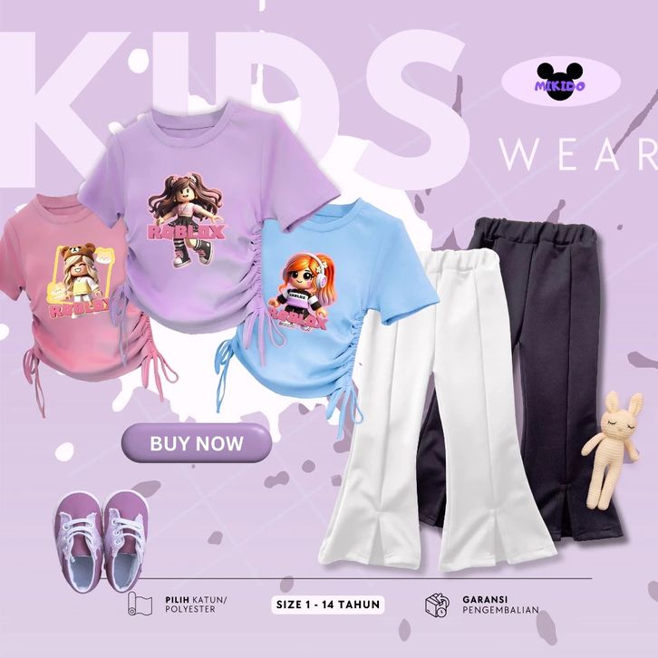Setelan Kaos Serut Crop Top Celana Cutbray Belah Anak Perempuan Roblox Baju Anak 1–14 Tahun Outfit Anak Perempuan