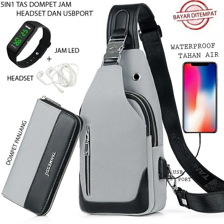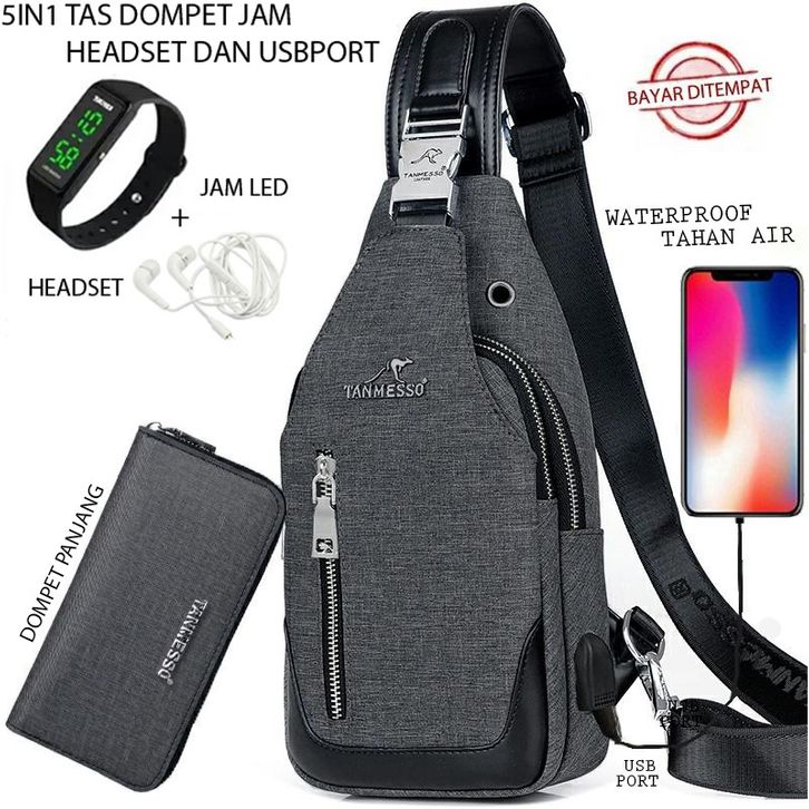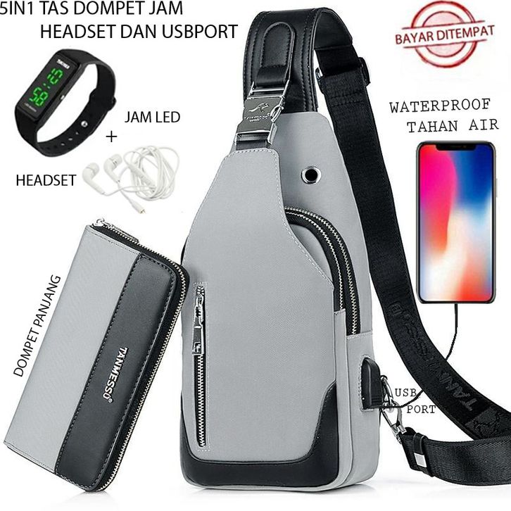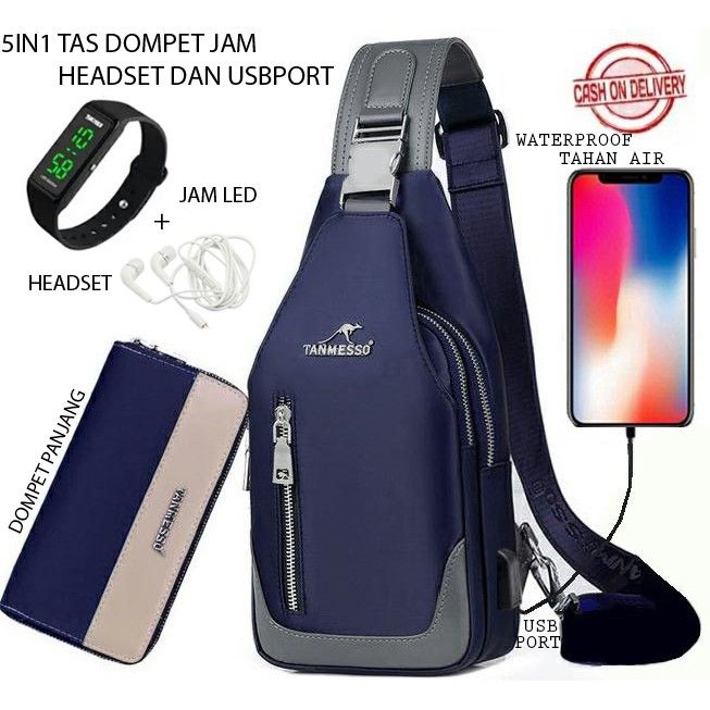 TANMESSO 5IN1 BAYAR DITEMPAT-BONUS JAM LED,DOMPET & USBPORT&HEADSET- TAS SELEMPANG PRIA