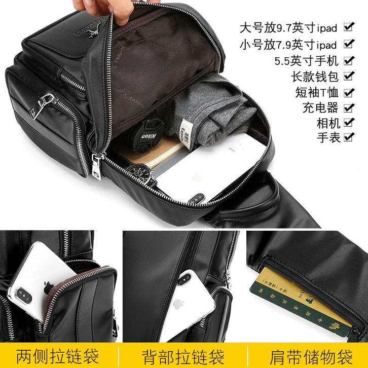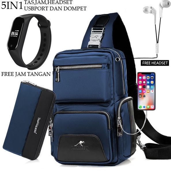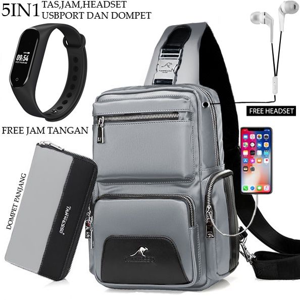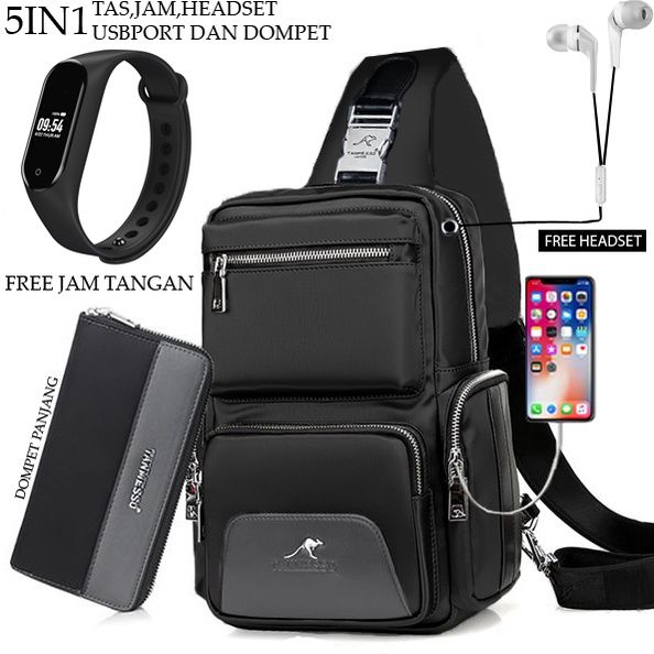 TANMESSO 5IN1 TAS SELEMPANG PRIA -BONUS JAM LED,DOMPET & USBPORT&HEADSET-BAHAN GLOSSY PREMIUM