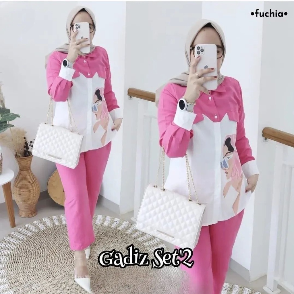 GADIZ SET / SETELAN CEWEK DEWASA TERKINI BAJU DAN CELANA BAHAN BEAUTYCREPE APLIKASI SABLON / PAKAIAN SET WANITA MURAH