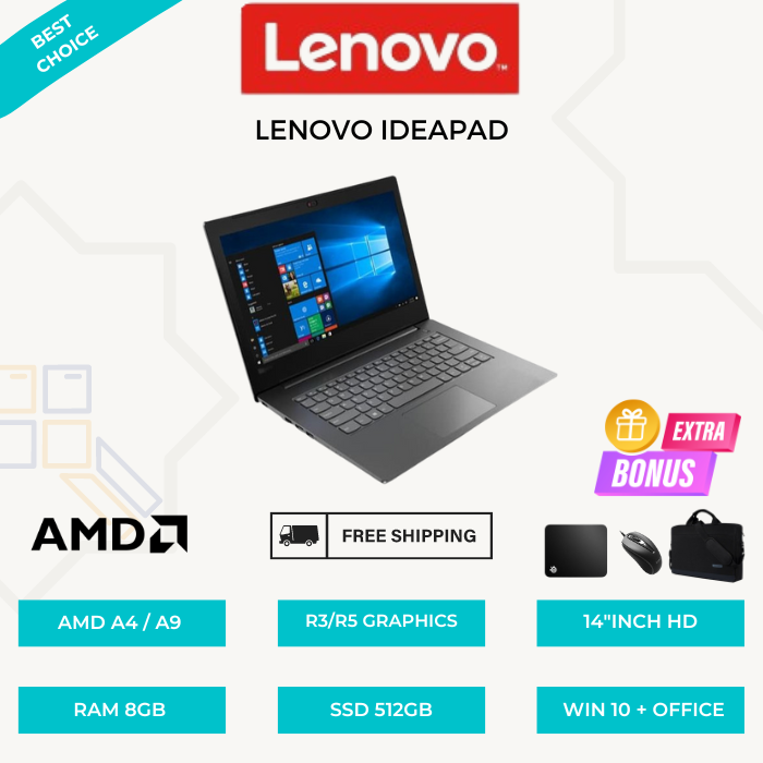 [BARU] LAPTOP LENOVO IDEAPAD AMD A4 / AMD A9 / RAM 8GB SSD 512GB WIN 10 + OFFICE 14"INCH // BONUS TAS & MOUSE