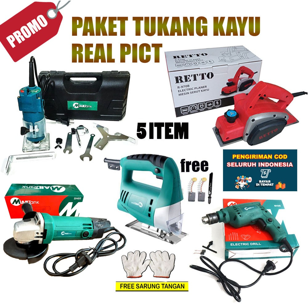 (5 ITEM) PAKET TUKANG KAYU PLEANER + GERINDA 4INCHI+ PROFIL + BOR 10 MM + JIGSAW MAILTANK