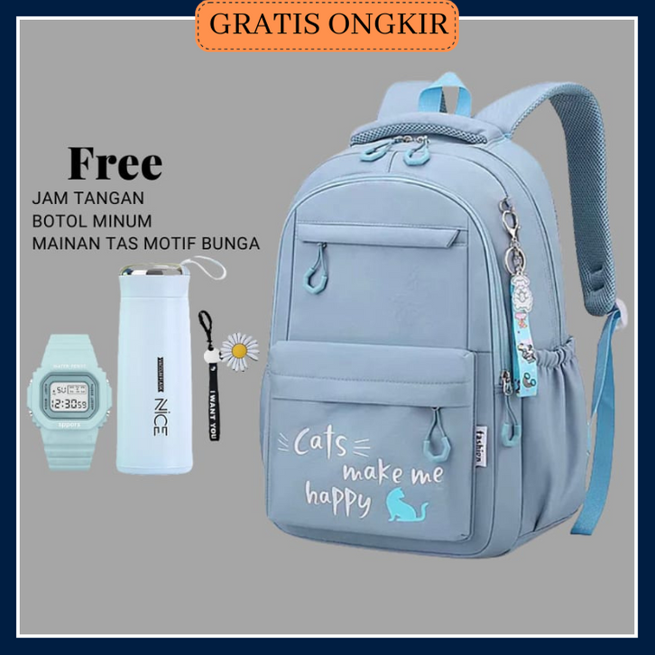 TAS SEKOLAH ANAK FREE JAM TANGAN + BOTOL MINUM TAS RANSEL "CATS MAKE ME HAPPY" BACKPACK WEIBO UNISEX TERBARU!!