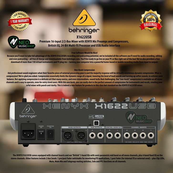 Behringer X1622USB Mixer with Compressors, British EQ, 24-Bit Multi-FX Processor