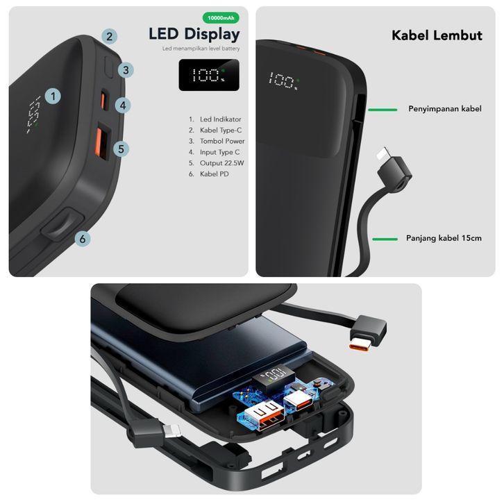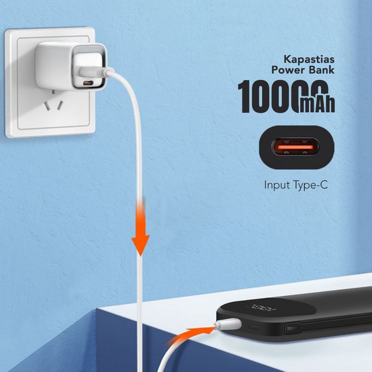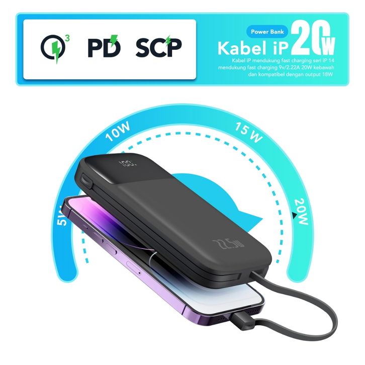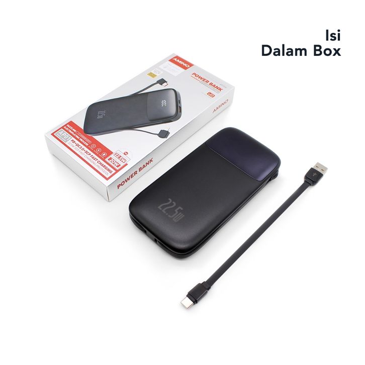 AMINO Powerbank 10000mAh PD 20W 22.5W Super Fast Charger Built-In Cable TYPE C Kabel QC 3.0 Power Bank Quick Charger LED