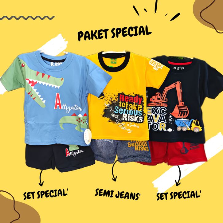 PAKET 3 PCS BAJU SETELAN ANAK COWOK SEMI JEANS KAOS MOTIF RANDOM