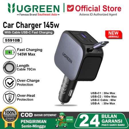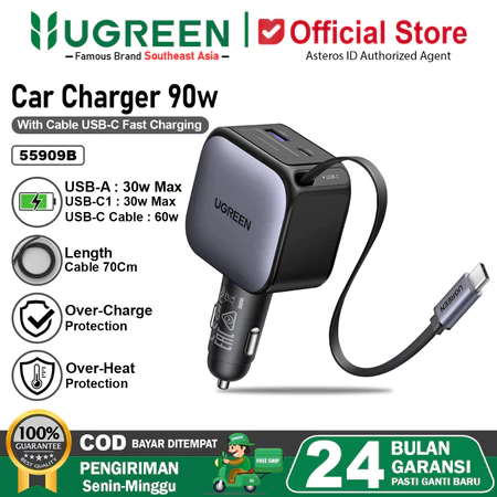 CHARGER MOBIL UGREEN FAST CHARGING TIPE C 2 IN 1 RETRACTABLE CAR CABLE 60W 145W TERBARU MURAH