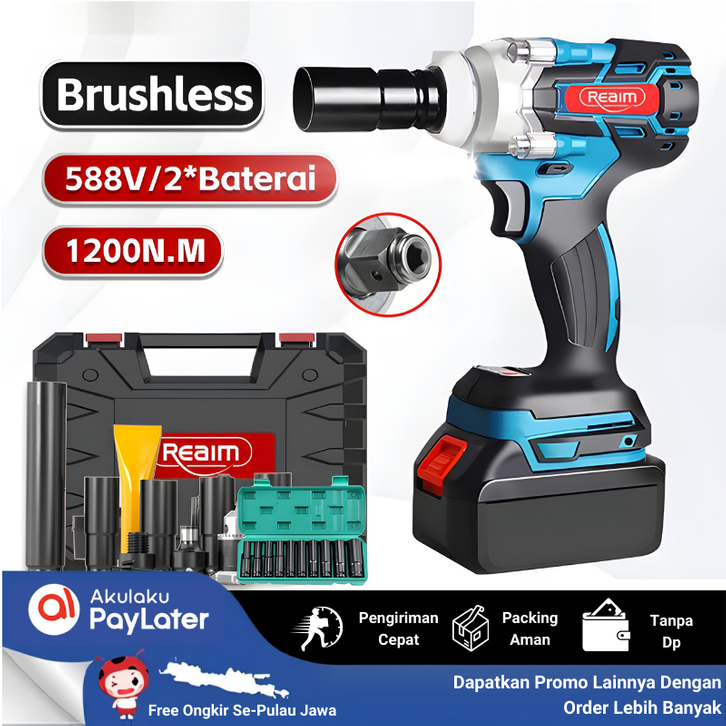Reaim Mesin Bor Impact Wrench Brushless 1200 Nm 558V 2 Baterai Listrik 1 Set Lengkap APR JLD Makita Tekiro Modern Isku