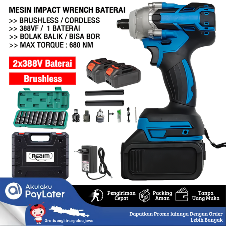 Reaim Mesin Bor Impact Wrench Multifungsi 1300Nm 388V 2 Baterai Jumbo Listrik 1 Set Lengkap APR JLD Makita Tekiro Zper