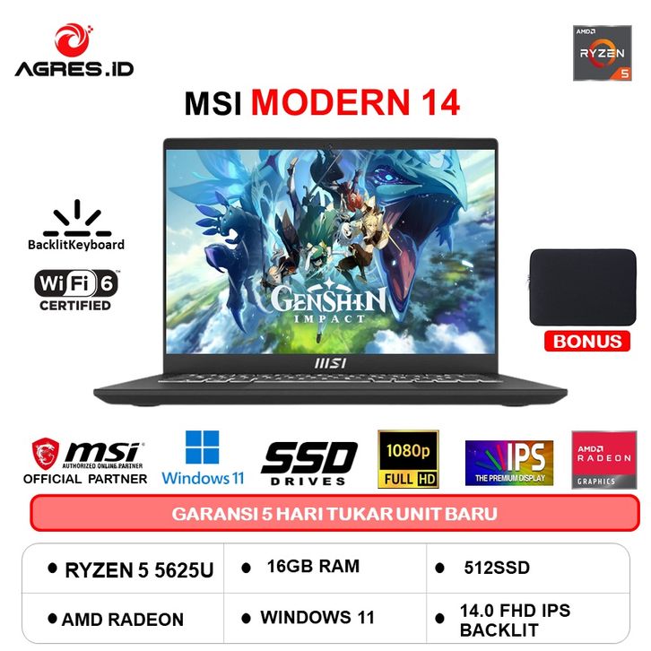 LAPTOP MSI MODERN 14 RYZEN 5 5625U 16GB 512SSD VEGA7 W11 14.0FHD IPS BLIT 2YR BLK -C5M.006 FREE ONGKIR