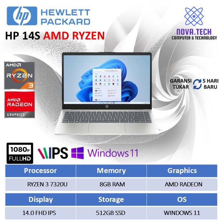 Laptop baru HP 14 EM0321AU | AMD Ryzen 3 -7320U RAM 8GB LPDDR5 SSD 512GB Layar 14.0" Windows 11 +OHS Garansi Resmi