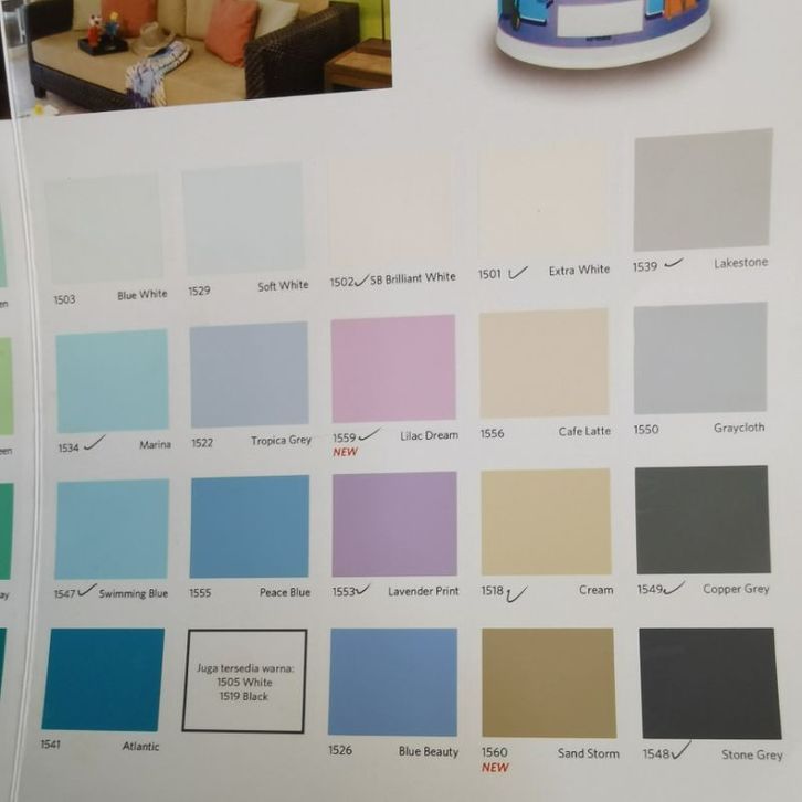Pink posy , Putih, Lime gree, Marina , Lily white , Cream , Orange torch, Sand strom , Stone gray, Peace blue, Happy fushcia , Victoria, Lavender print, Bright green , Moon glow, Sunshine , Jasmine, Lilac dream, Hijau telor, Lake stone, Tropica grey , Candy pink, Copper grey, Green freeway , Blue beauty, Chiffon , Sunset, Atlantic , Hibiscus , Sb briliant white, Graycloth , Clear sky, Ivory , Sku blue, Extra white , Real morando, Durian, Goby , sand Lemon, blue white, Swiming Blue