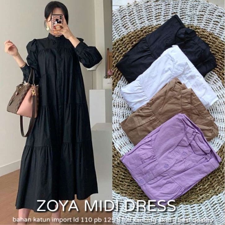 Gamis Cewek Zoya Midi Dress Full Kancing Fashion Dress Lengan Panjang Busui Friendly Pakaian Muslimah Lebaran