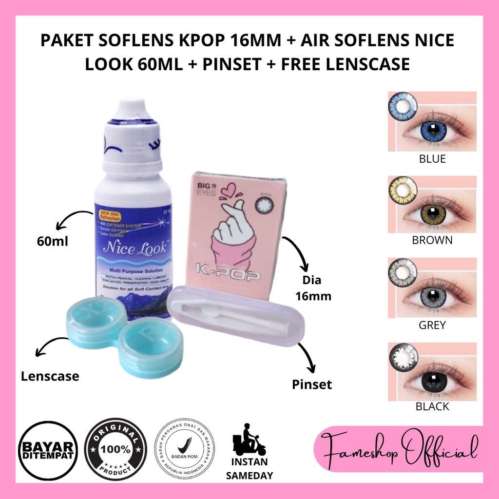PAKET SOFTLENS KPOP DIA 16MM + CAIRAN NICE LOOK 60ML + PINSET + LENSCASE / INSTAN SAMEDAY / LENSA KONTAK / PAKET MURAH