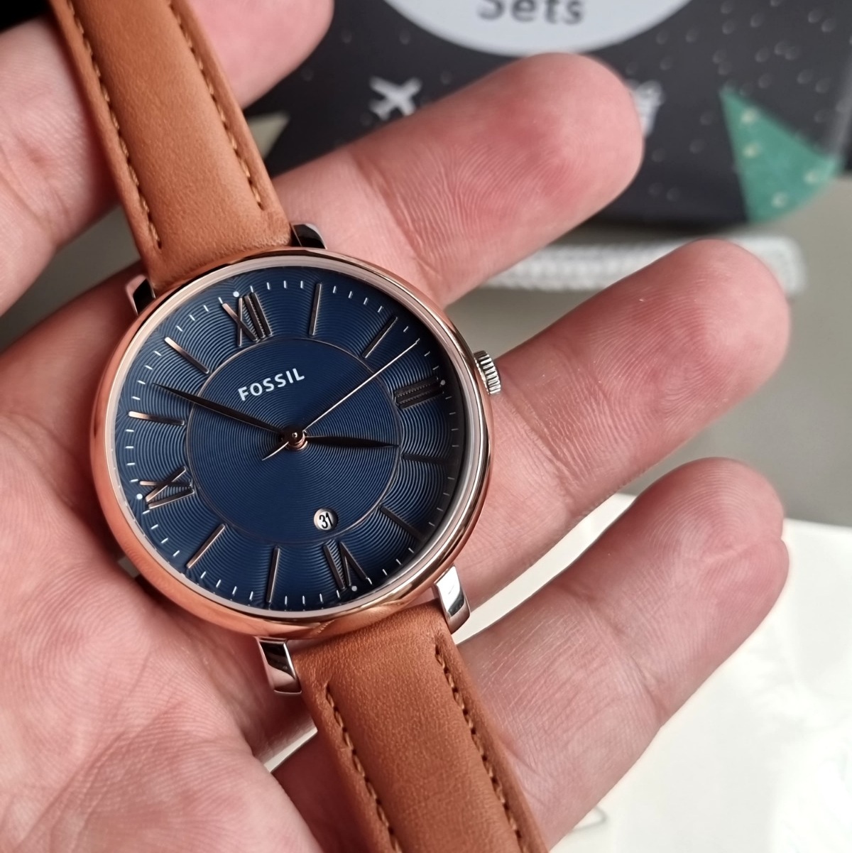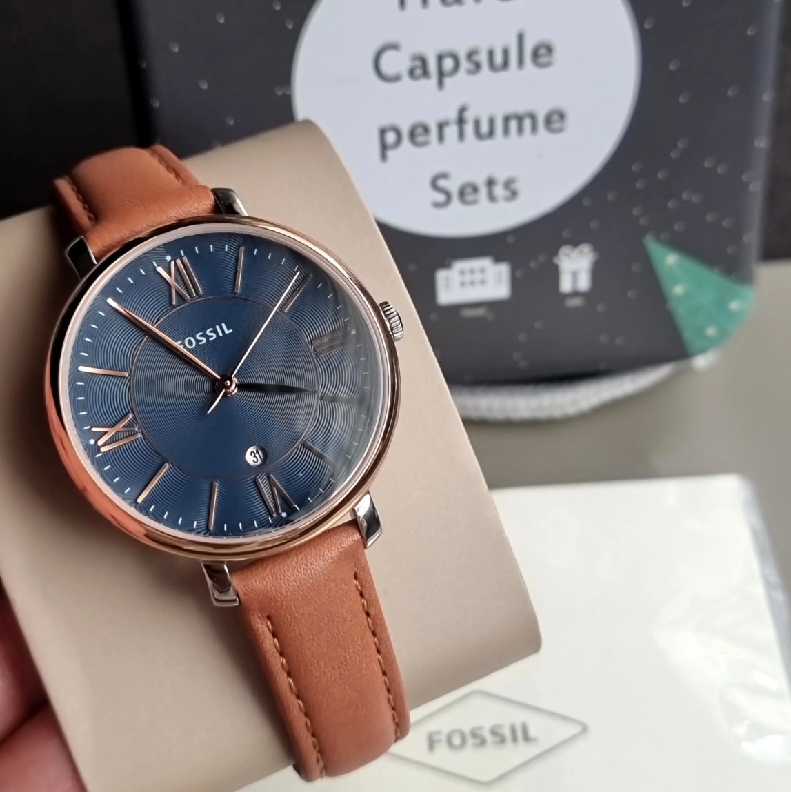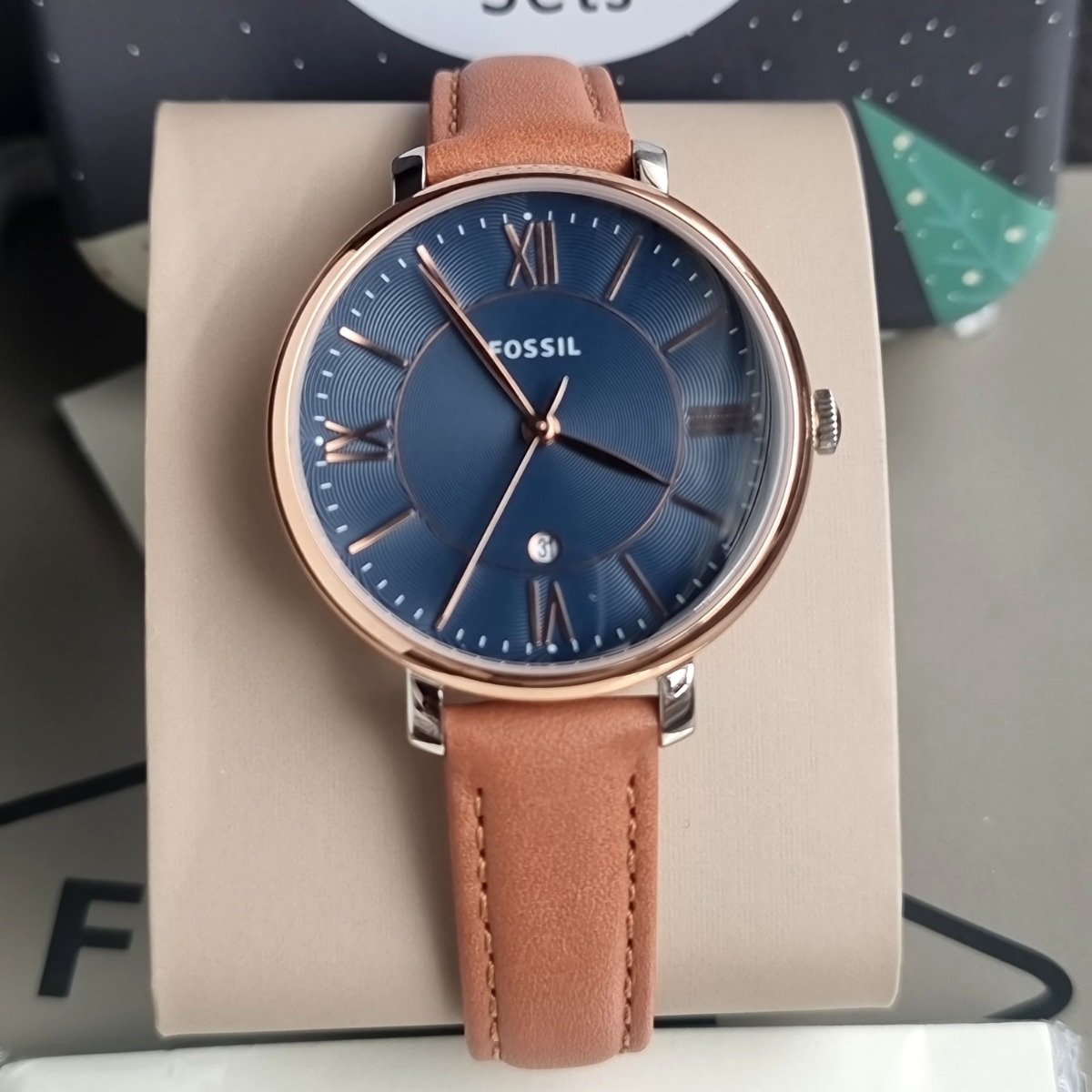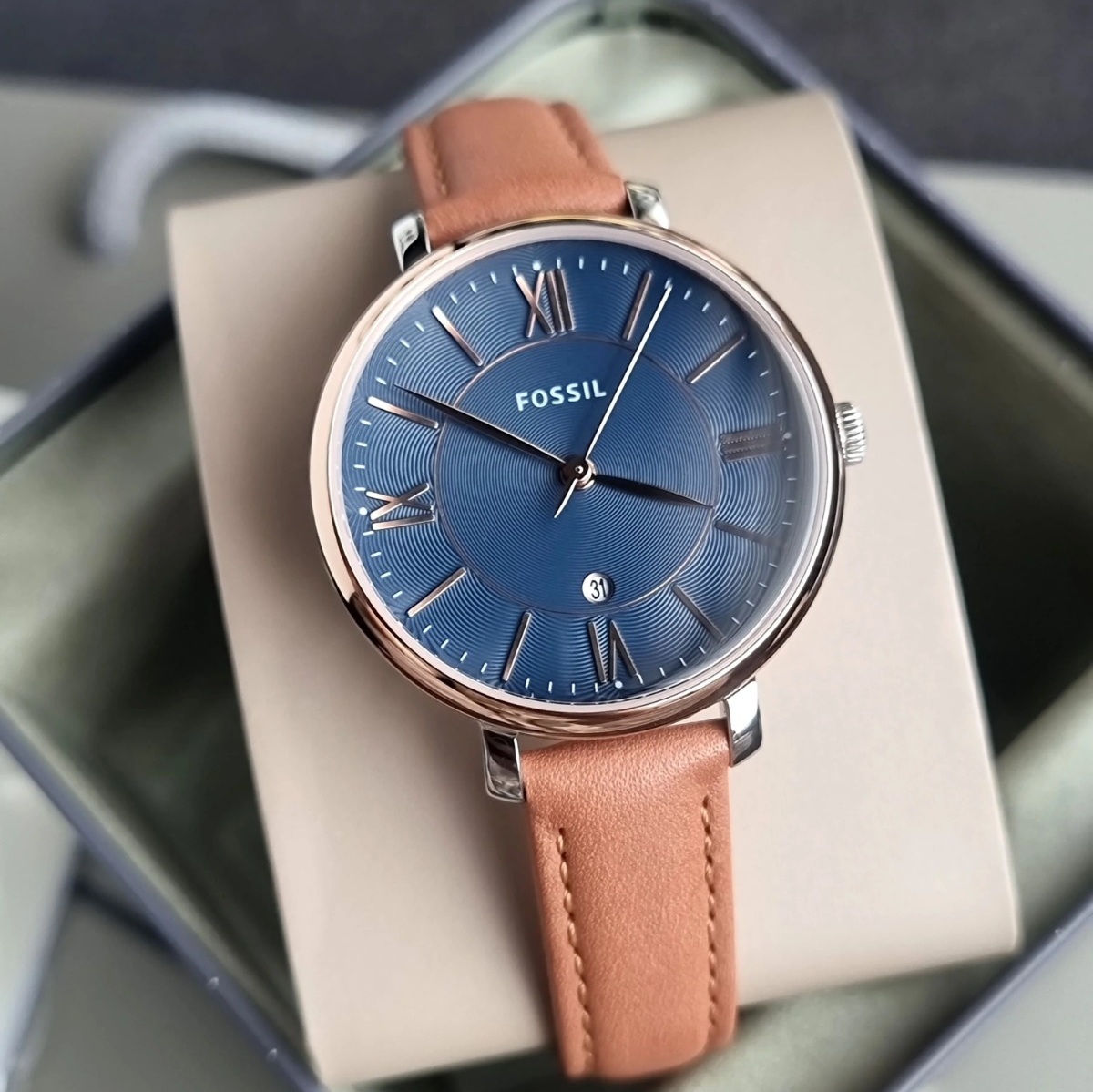 JAM TANGAN WANITA FOSSIL ES4274 / ES 4274 ROSEGOLD NAVY BROWN LEATHER FULL SET FREE ONGKIR