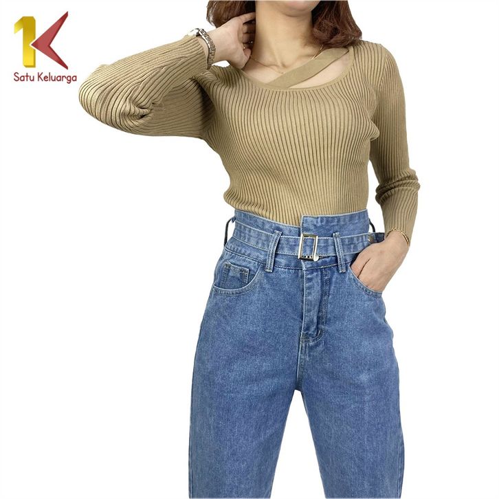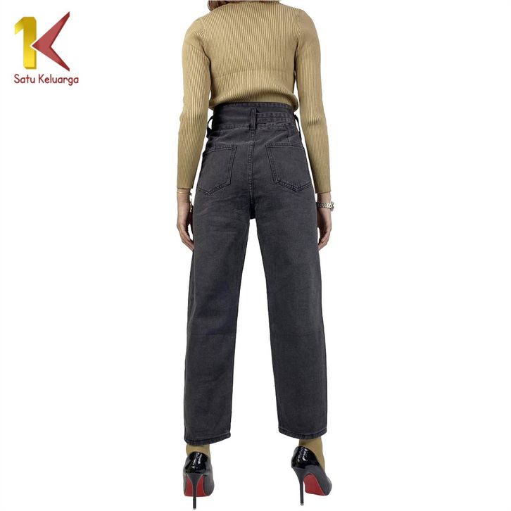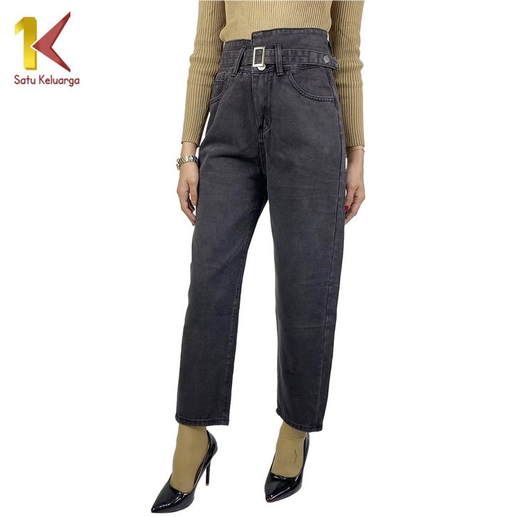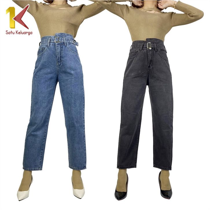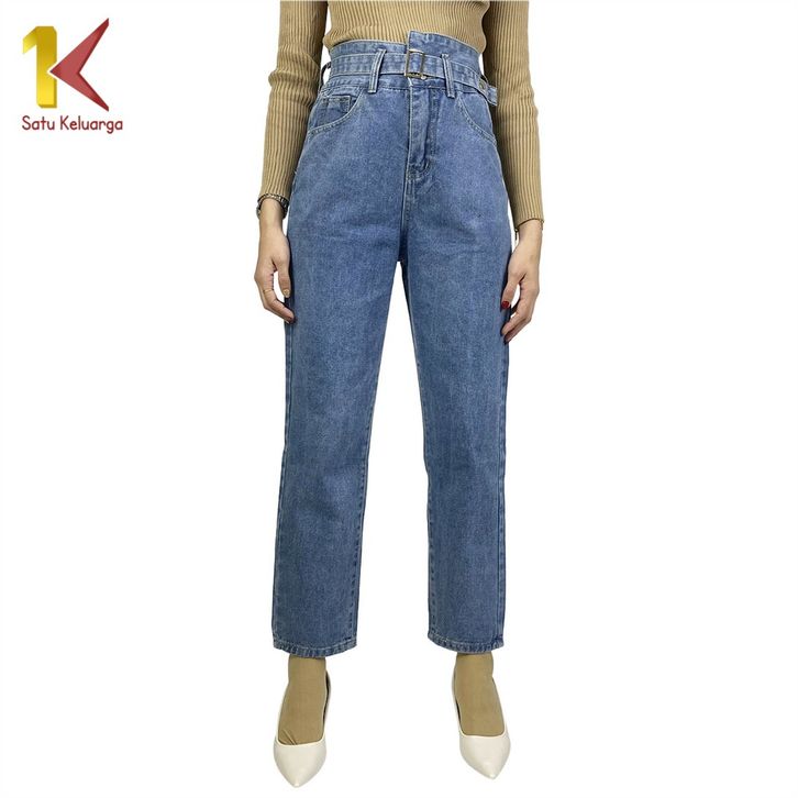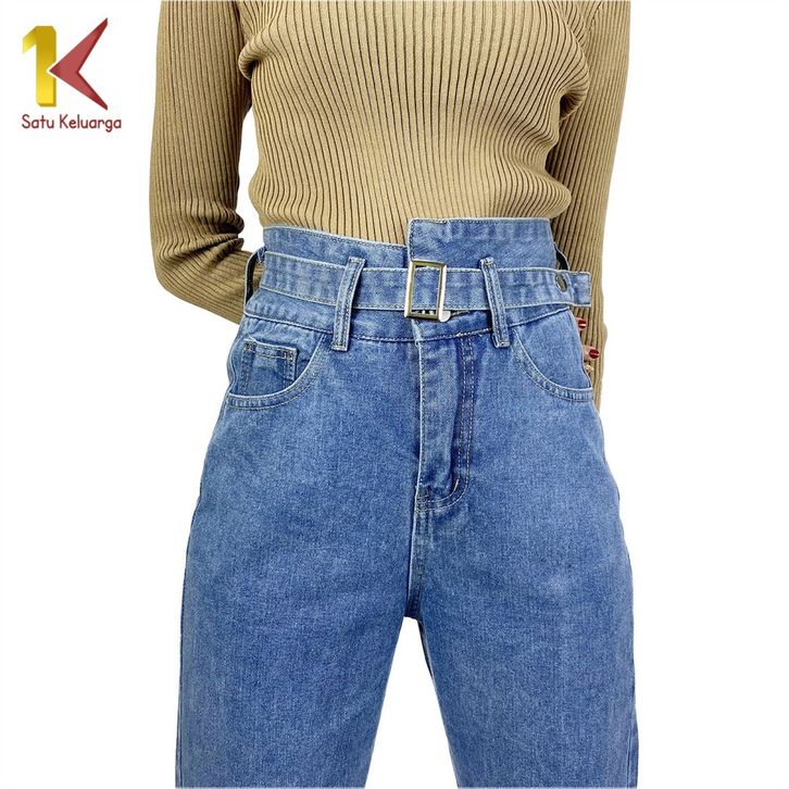 Boyfriend Jeans Highwaist Wanita dengan Aksesoris Tali Pinggang / Jeans Celana Panjang Cewek Kekinian Long Pants 1K P555