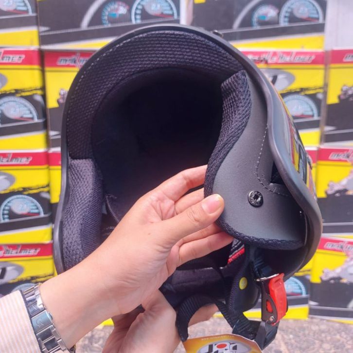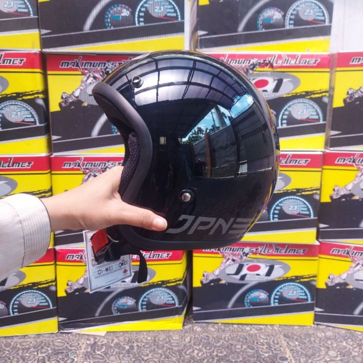 HELM JPN Hitam black glossy HELMET MOTOR BOGO RETRO POLOS PRIA WANITA PAKET KACA DATAR FLAT VISOR