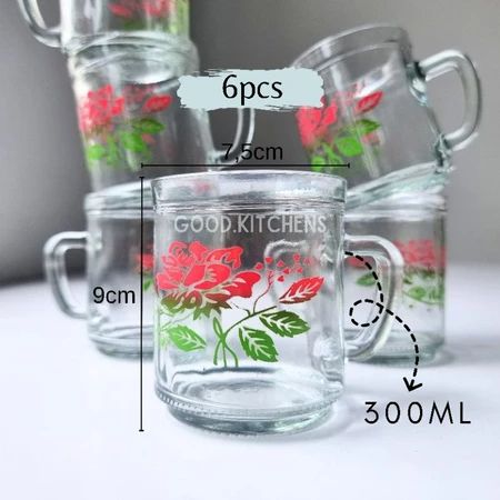GELAS KOPI KACA GELAS MINUM GELAS GAGANG GELAS MURAH GELAS SOUVENIR GELAS WARTEG MOTIF BUNGA G285 [6 PCS]