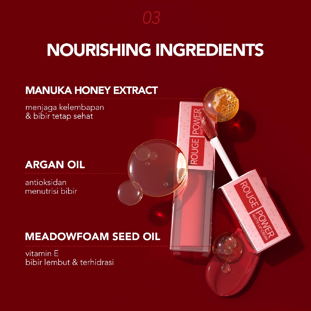 YOU Rouge Power Matte Lip Cream Lipstik | Matte Finish | Tahan Lama | Nourishing with Manuka Honey | Kosmetik