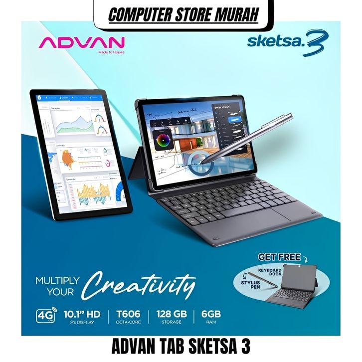Advan Tab Sketsa 3 Layar 10.1” HD IPS 128GB+RAM 6GB Tiger T606 Android 13 Dual Sim Card Free Keyboard & Stylus Pen