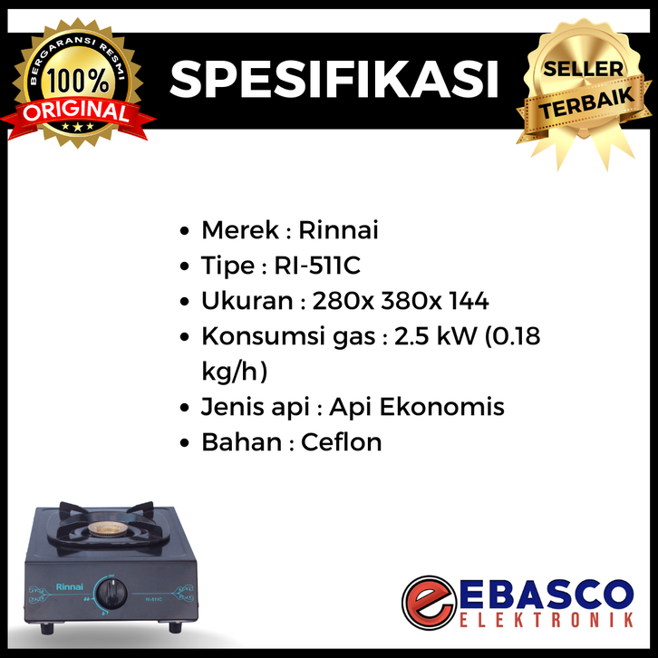RINNAI Kompor Gas RI 511 C / RI511C - 1 Tungku Bahan Ceflon Anti Karat