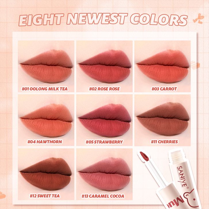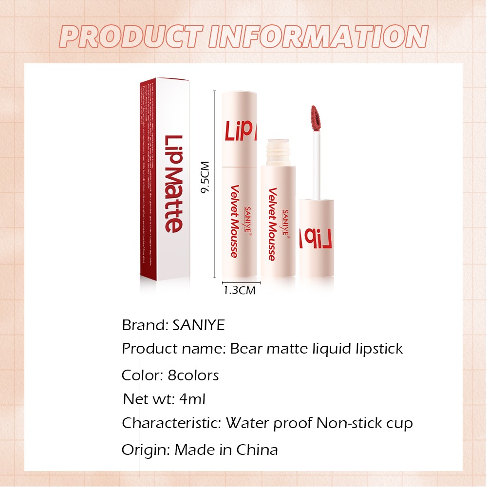 SANIYE 8 Colors Lipstick Liiquid Matte Bear Lipcream Matte Lembut Tahan Lama Anti Air ORIGINAL L1223