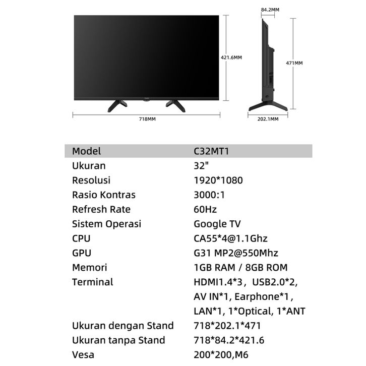 NEW CHiQ Google TV 32 inch FHD Google Smart TV Digital TV Dolby Audio Google Assistant (C32MT1)