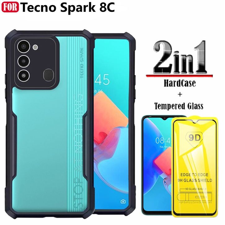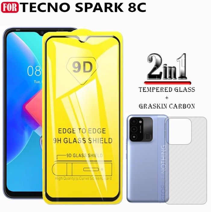 Paket 3 in 1 Tecno Spark 8C Hardcase Transparant + AntiGores Kaca + Garskin Carbon