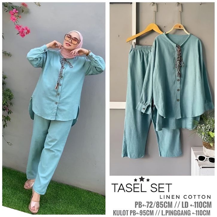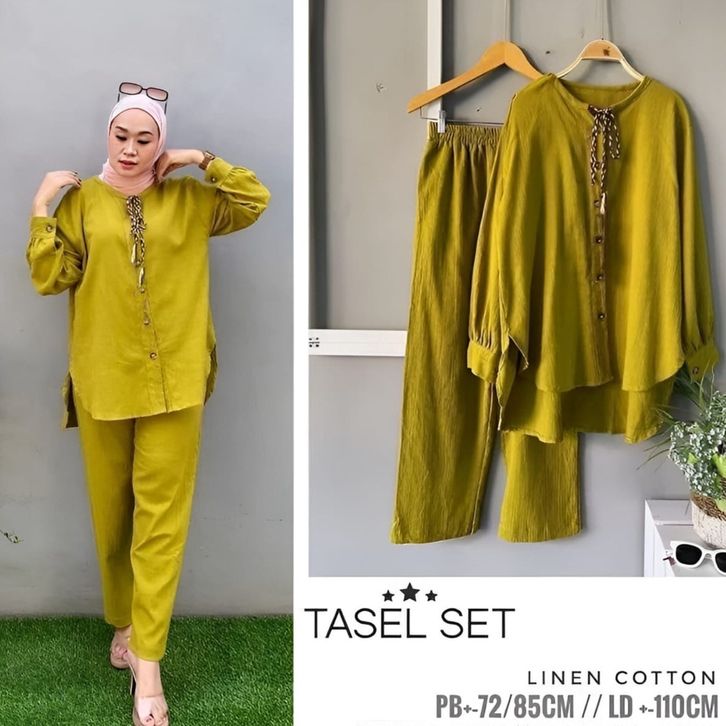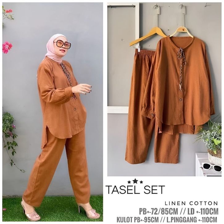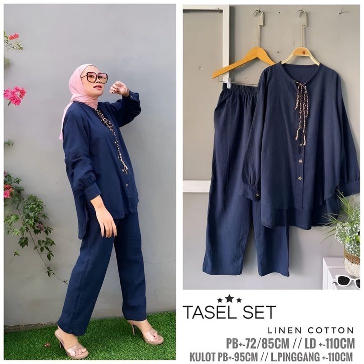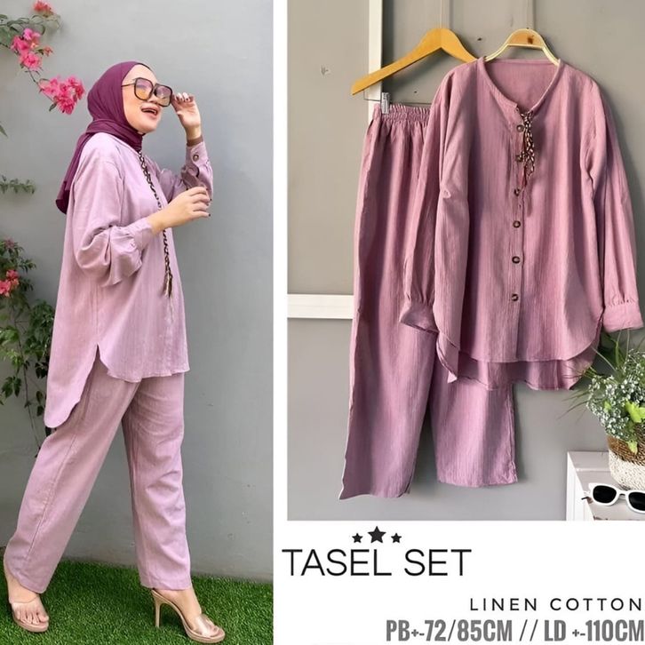 Vallinoutfit - Tasel One Set Linen Rami Premium Baju Setelan Muslim Wanita Polos Oversize Terbaru