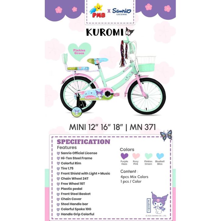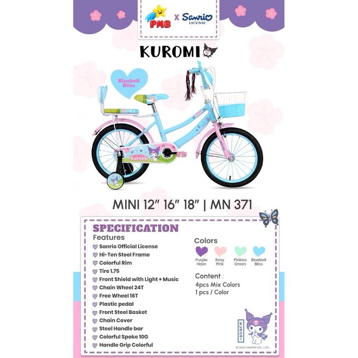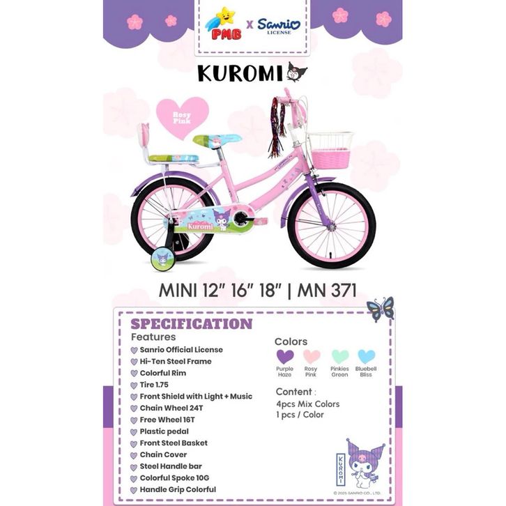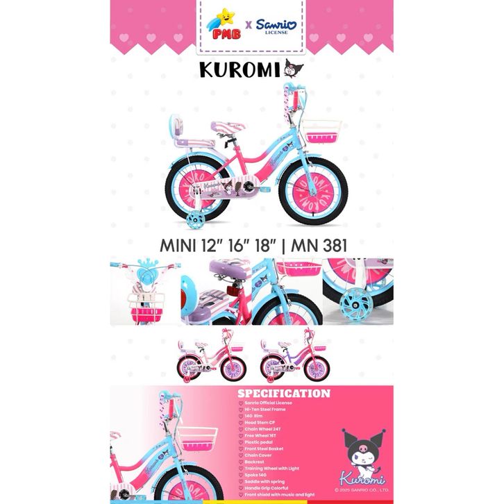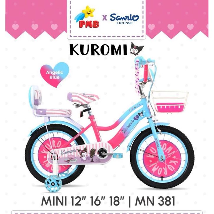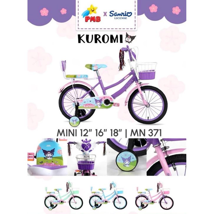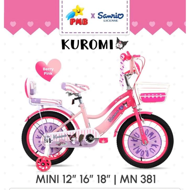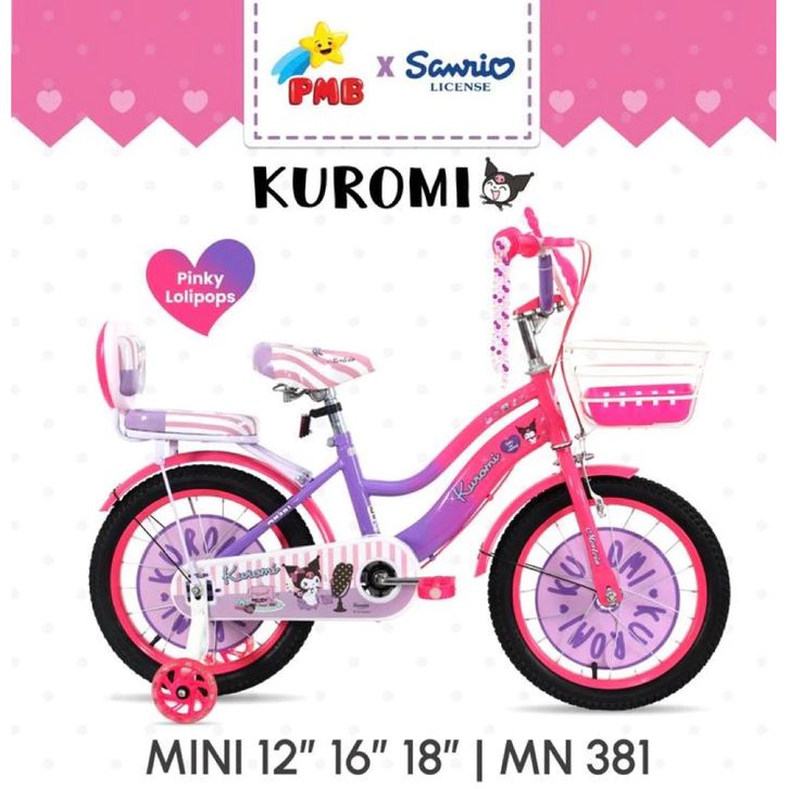 SEPEDA ANAK PEREMPUAN PMB 12 16 18 MORTEIN KUROMI LISENSE SANRIO SEPEDAH TERBARU KARAKTER KERANJANG MUSIK BEST SELLER