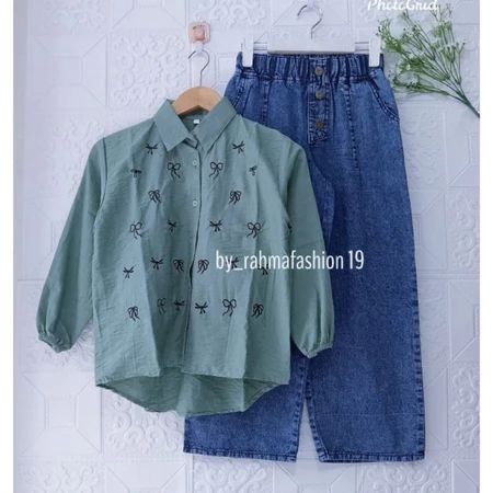 Setelan kemeja motif anak perempuan tanggung kulot jeans highwaist usia 8 tahun 9 tahun 10 tahun 11 tahun premium