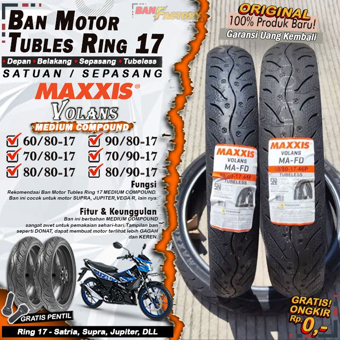 Ban Motor Tubeless Maxxis Volans Ring 17 Ban Motor Vixion Satria Supra Jupiter Tubles Depan Belakang Sepasang Ring 17