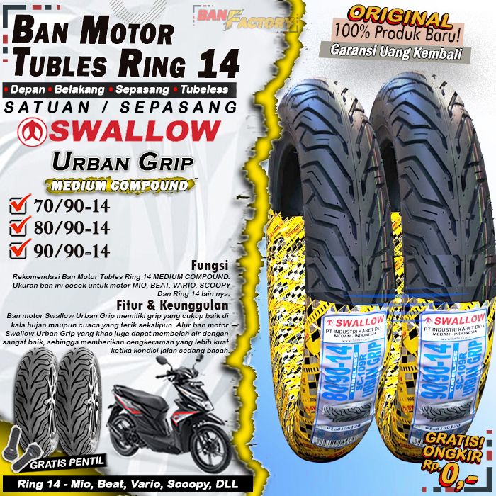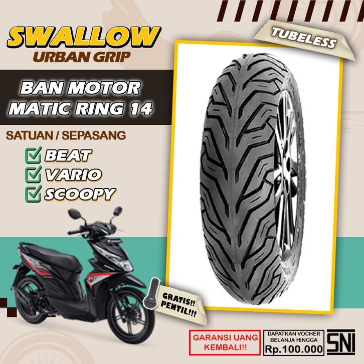 Ban Motor Matic Tubeless Swallow Urban Grip Ring 14 Ban Motor Beat Vario Scoopy Tubles Depan Belakang Sepasang Ring 14