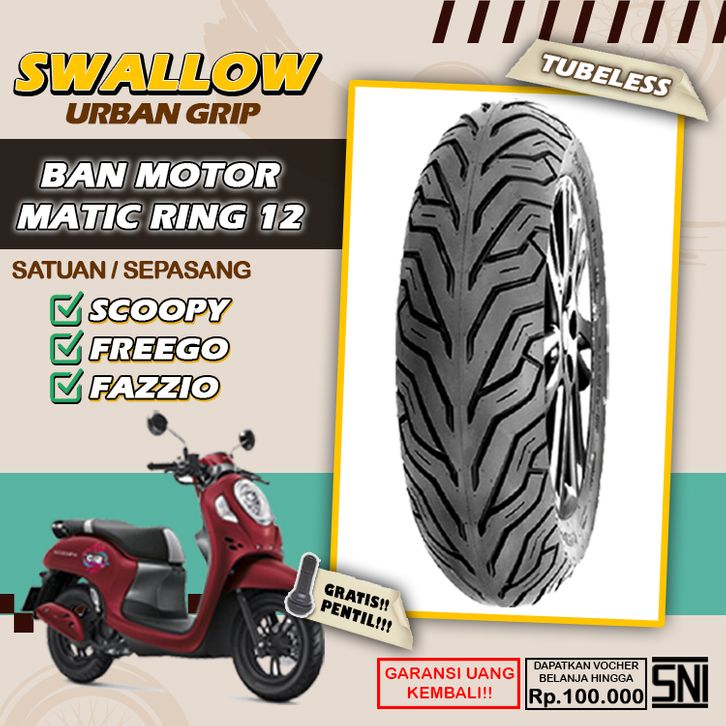 Ban Motor Matic Tubeless Swallow Urban Grip Ring 12 Ban Motor Scoopy Freego Tubles Depan Belakang Sepasang Ring 12