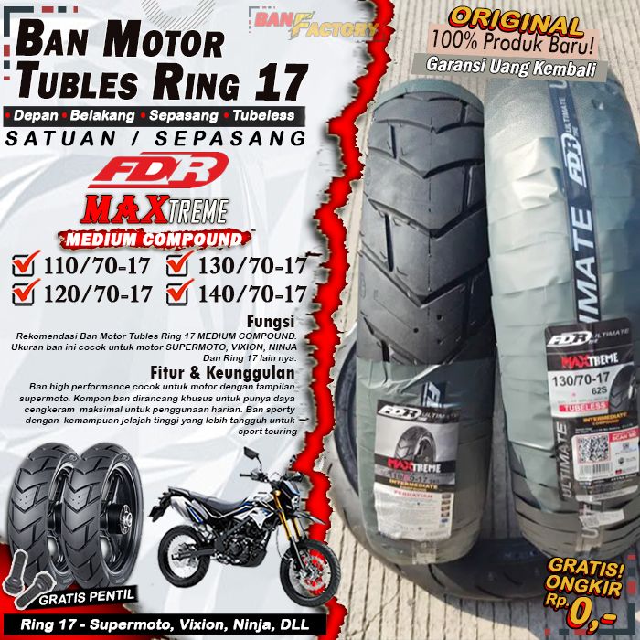 Ban Motor Tubeless FDR Maxtreme Ring 17 Ban Motor Vixion Ninja Supra Satria Tubles Depan Belakang Sepasang Ring 17